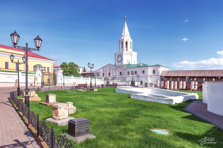 Смотровую площадку Казанского Кремля, с которой открываются фантастически красивые виды на Казань: вид на реку Казанку, Центр семьи "", Дворец Земледельцев, Кремлёвскую набережную, аквапарк "Ривьера", спортивные объекты, построенные к Универсиаде – 2013 и современные постройки;